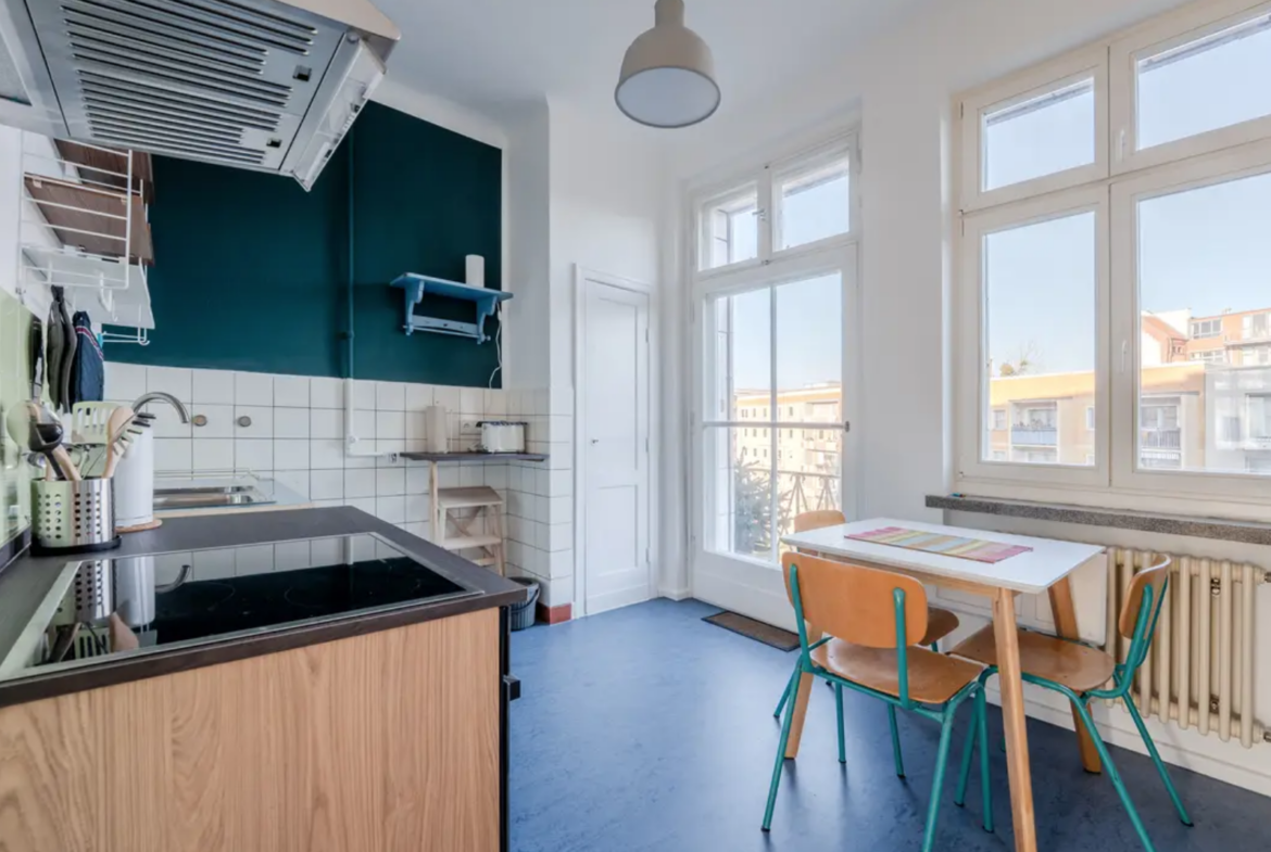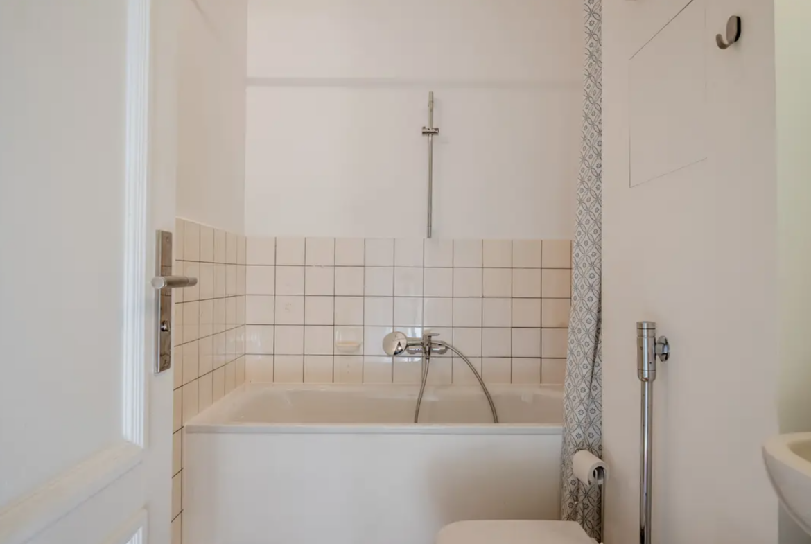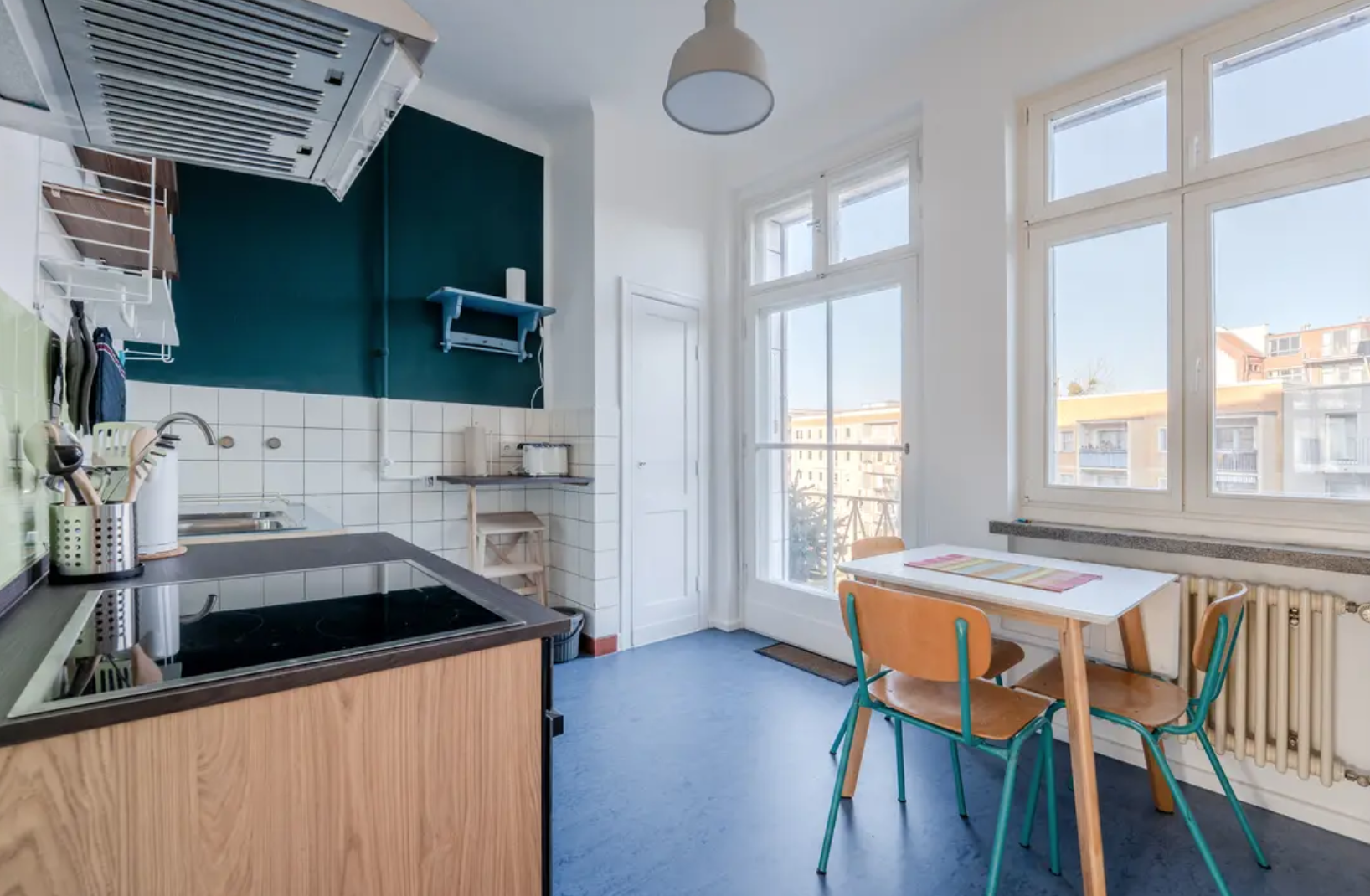 Die Wohnung befindet sich im 4. Obergeschoss und ist bequem mit dem Aufzug erreichbar. Sie wurde vollständig und denkmalgerecht renoviert, mit dem Ziel, die architektonischen Qualitäten des Gebäudes zu bewahren und hervorzuheben. Die Linoleumböden greifen die ursprünglichen Materialien der Bauzeit auf, während im Flur die originalen, maßgefertigten Einbauregale erhalten und restauriert wurden – ein charakteristisches Detail von hohem gestalterischem und historischem Wert. Die Sanierung verbindet modernen Wohnkomfort mit dem Respekt vor der ursprünglichen Bausubstanz und betont die Großzügigkeit der Räume, die solide Bauweise und die zeitlose Eleganz dieses architektonischen Ensembles.